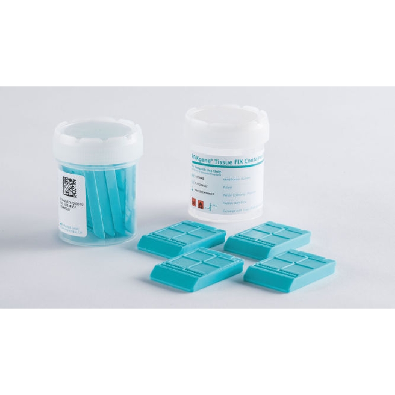 PAXgene Tissue FIX Container (50 ml)可固定并稳定组织样本(该产品具有4个标准组织保存仓,最多可处理4个样本,每个样本体积**可达4 x 15 x 15 mm;也可处理单个样本,其**体积为20 x 20 x 20 mm)。PAXgene Tissue FIX Containers (50 ml)为预装有50 ml PAXgene Tissue FIX溶液的单腔容器。PAXgene Tissue FIX可快速浸透并固定组织,保存组织形态。其固定效果与福尔马林固定相当,但不会损伤核酸,无核酸交联和降解。固定后,去除PAXgene Tissue FIX,并在同一容器中加入PAXgene Tissue STABILIZER。样本中的核酸、蛋白质和样本的组织形态可在室温下保持长达7天,在2–8°C、–20°C或–80°C可保存更长时间。稳定的样本可包埋在石蜡中用于组织学研究。PAXgene Tissue Kits配合补充实验方案可从上述样本中,高效进行后续的RNA、miRNA、DNA和/或蛋白质纯化。 PAXgene Tissue FIX Container (50 ml)仅可与PAXgene Tissue STABILIZER配合使用。