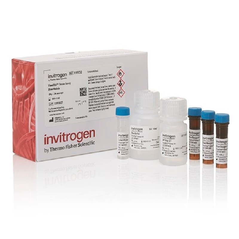 This VewRNA Tissue Assay Blue Module is designed for use with the ViewRNA Tissue Assay Core Kit. The Core Kit, when combined with a ViewRNA Tissue probe set (purchased separately), enables the detection of a single mRNA target in tissue sections using the Fast Red substrate. The ViewRNA Tissue Assay Blue Module enables the detection of a second mRNA target using the Fast Blue substrate and must be used in combination with the Core Kit and two probes sets in order to run a 2-plex assay. Each kit contains sufficient reagents to process a minimum of six slides at a time. ViewRNA TYPE 1 probe sets are for use with the Fast Red substrate (Core Kit), while ViewRNA TYPE 6 probe sets are for use with the Fast Blue substrate (Blue Module).