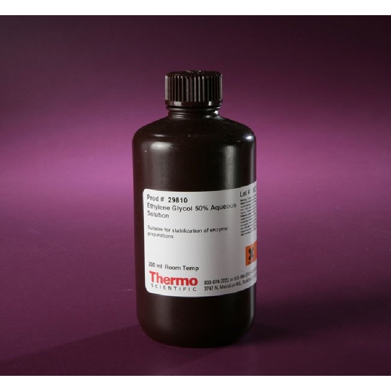 This product is a 50% (w/v) aqueous solution of highly purified ethylene glycol. When mixed in equal volume with purified protein samples, such as primary antibodies, the solution stabilizes and maintains the mixture as a liquid during freezer storage (-20°). Ethylene glycol is a suitable alternative to glycerol for most protein-storage applications. In fact, this preparation of ethylene glycol is devoid of various common glycerol impurities and potiential degradation products that are damaging to certain enzymes.