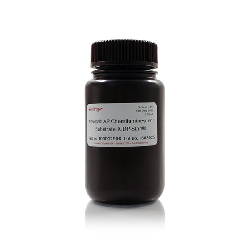 Novex® AP Chemiluminescent Substrate is a non-radioactive ready-to-use solution of CDP-Star for chemiluminescence-based immunodetection of alkaline phosphatase (AP) on western blot or dot blot membranes. This reagent provides detection sensitivities superior to that of precipitating chromogenic substrates. Low picogram levels of detection can be achieved using either X-ray film or imaging equipment.