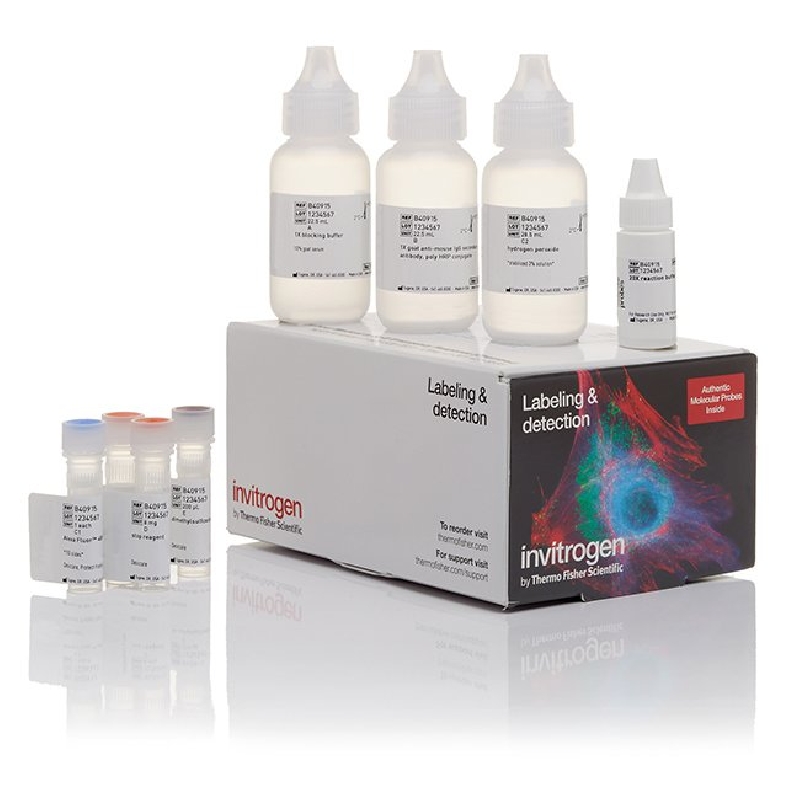 1 kit sufficient for 150 microscope slides (18 x 18 mm), containing: • Blocking buffer (1X), 22.5 mL • Poly-HRP-conjugated goat anti-mouse secondary antibody (1X), 22.5 mL • Alexa Fluor tyramide reagent • Hydrogen peroxide (stabilized 3% solution), 28.5 mL • Reaction buffer (20X), 6 mL • Reaction stop solution, 8 mg • Dimethylsulfoxide (DMSO), 200 µL Store at 2-8°C. When stored as directed, the product is stable for 6 months after receiving. |