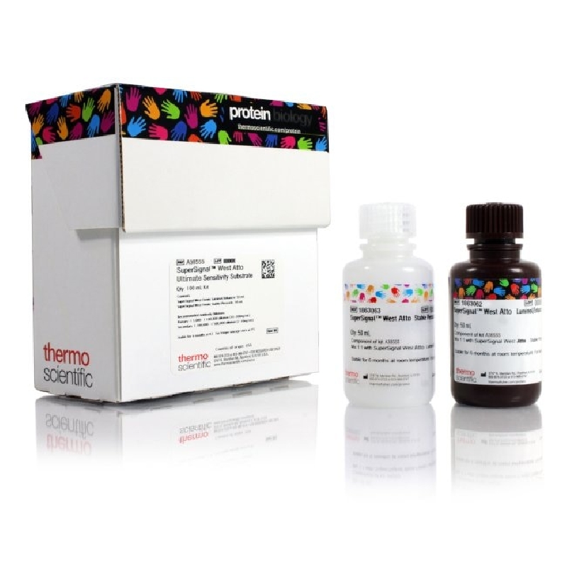 SuperSignal West Atto Ultimate Sensitivity Chemiluminescent Substrate is designed for superior sensitivity and signal-to–noise ratios for very low abundant targets or precious samples in western blot analysis. When combined with optimized antibody concentrations and blocking buffers, SuperSignal West Atto substrate enables detection of target proteins in amounts that are too small to be seen with typical high performance ECL substrates.