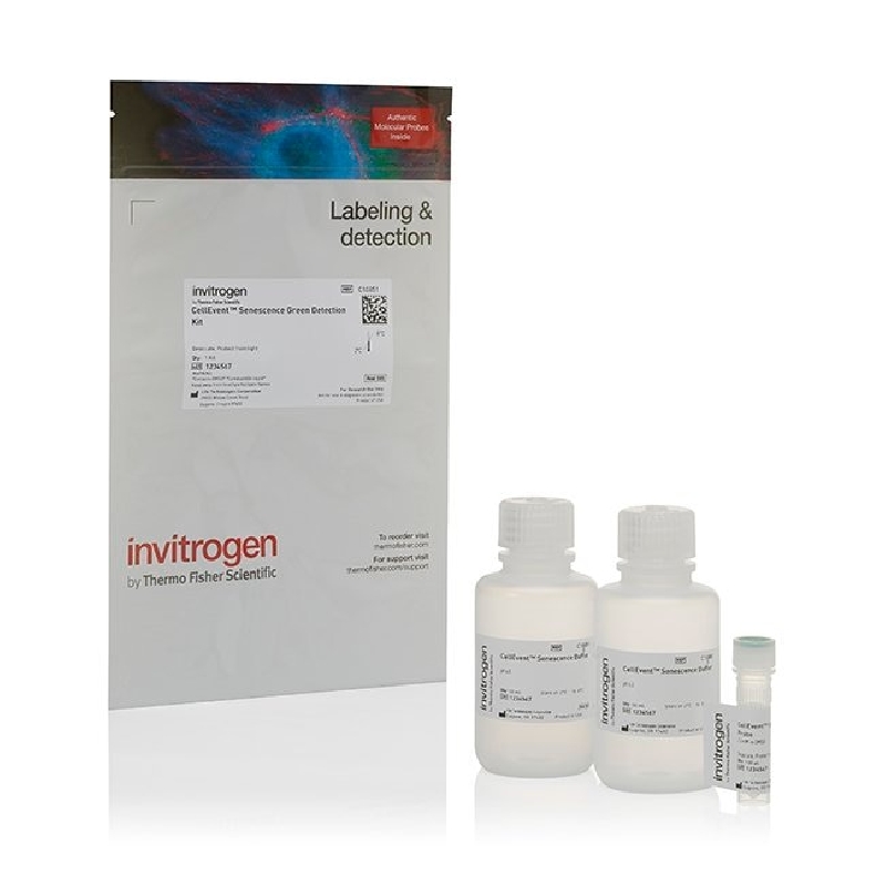 The CellEvent Senescent Green Kit provides CellEvent Senescent Green probe and an optimized buffer for the detection of senescent cells in fixed samples. This probe can be multiplexed with other fluorescent reagents compatible with paraformaldehyde fixation.