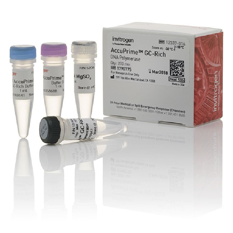 • 1 x 100 μL AccuPrime GC-Rich DNA Polymerase (2U/µL) • 1 x 1 mL 5X AccuPrime GC-Rich Buffer A • 1 x 1 mL 5X AccuPrime GC-Rich Buffer B • 1 x 1 mL 50 mM MgSO4 Store at -20°C. |
