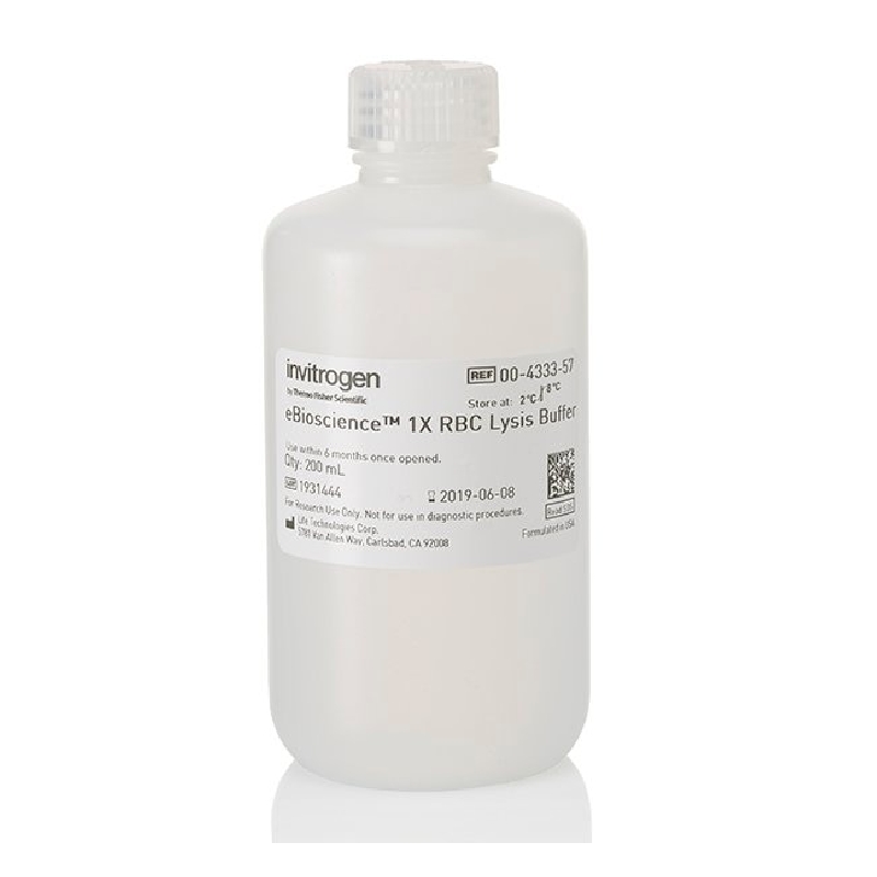 This 1X Red Blood Cell (RBC) Lysis Buffer is formulated for optimal lysis of erythrocytes in single-cell suspensions of mouse hematopoietic tissues such as spleen and human peripheral blood. This buffer contains ammonium chloride, which lyses red cells with minimal effect on lymphocytes when used as instructed. Nucleated red cells are not effectively lysed with ammonium chloride.