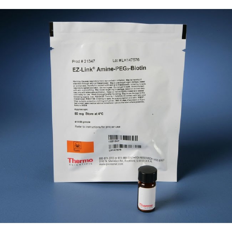 Thermo Scientific EZ-Link Amine-PEG3-Biotin is a water-soluble biotin compounds containing a polyethylene glycol (PEG) spacer arm and a terminal primary amine for conjugation via EDC and other crosslinker methods.
