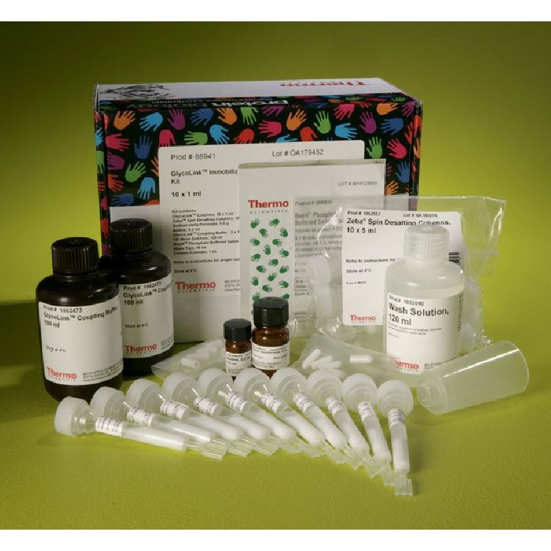 The Thermo Scientific GlycoLink Immobilization Kit contains affinity columns and reagents to immobilize glycoproteins through oxidized sugar groups for use in affinity-purification applications or studies of protein-protein interactions.