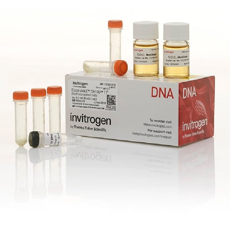 Contains: • ElectroMAX DH10B T1 Phage-Resistant Cells: 5 vials, 100 µl each • pUC19 DNA (10 pg/µl): 1 vial, 50 µl • S.O.C. medium: 2 bottles, 6 ml each Store Competent Cells at -80°C. Store pUC19 DNA at -20°C. Store SOC Medium at 4°C or at room temperature. |