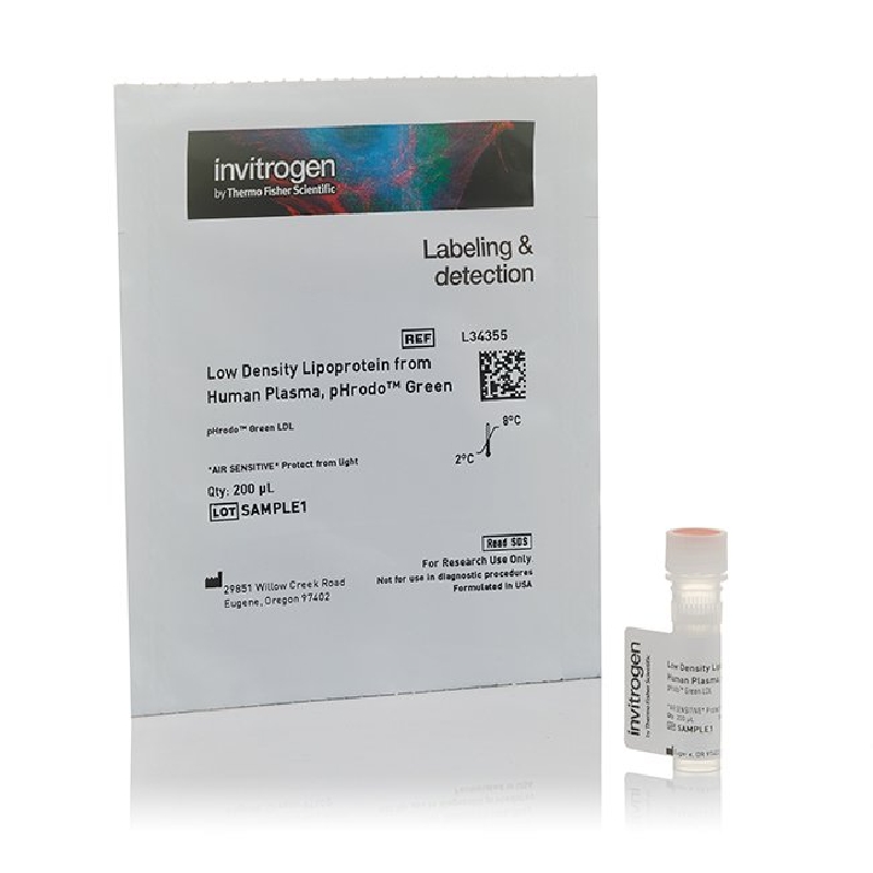 Human low density lipoprotein (LDL) is one of the key lipid:protein complexes in blood and is a crucial component of metabolism responsible for the transport of lipids throughout the body. This Low Density Lipoprotein From Human Plasma complexed with pHrodo Green dye (pHrodo Green-LDL) is a valuable tool in studies of LDL uptake through endocytosis and trafficking of LDL throughout the cell. pHrodo Green-LDL is dimly fluorescent at neutral pH outside of cells, but fluoresces brightly after endocytosis. This feature allows for a no-wash protocol when using pHrodo Green-LDL, enabling kinetic measurement of LDL uptake, endosomal maturation, and trafficking in cells. This fluorescently-labeled LDL has been designed for use with fluorescence microscopy, flow cytometry, cell sorting, high-throughput analysis, and high content analysis.