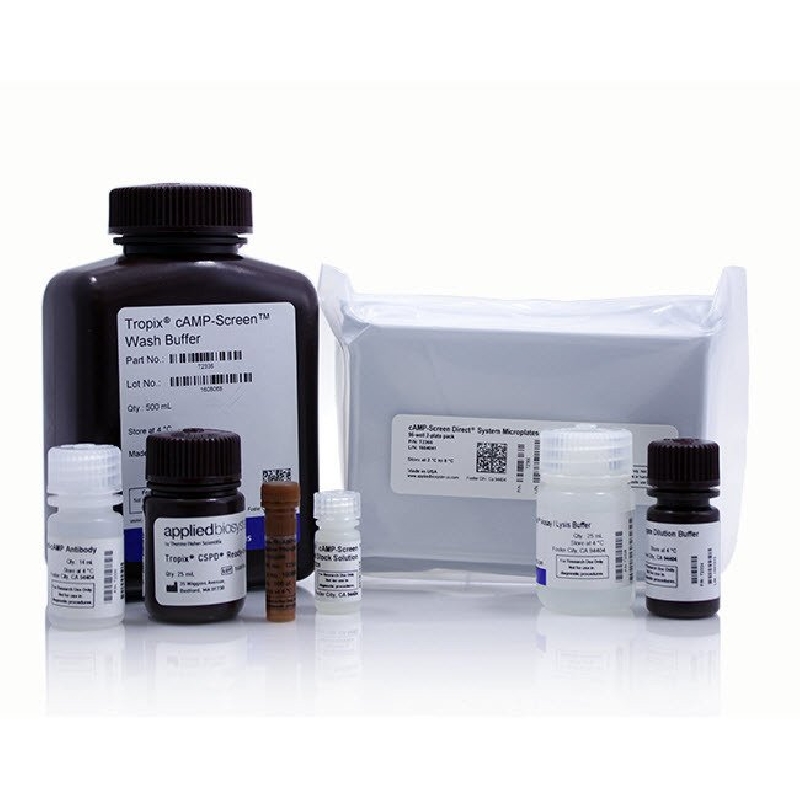 The cAMP-Screen Direct® 96-well Cyclic AMP Immunoassay System enables ultrasensitive determination of cyclic AMP (cAMP) levels in cell lysates. This competitive chemiluminescent immunoassay is formatted with maximum flexibility to permit either manual reagent additions or automated high-throughput processing. The cAMP assay utilizes the highly sensitive chemiluminescent CSPD® Substrate with Sapphire-II™ Enhancer that is triggered by an enzyme conjugate composed of cAMP bound to alkaline phosphatase (cAMP-AP). The chemiluminescent substrate/enhancer formulation is a ready-to-use reagent that generates a sustained-glow light emission from 30 minutes after addition. This assay is mainly used in secondary screening and pre-clinical research, where sensitivity and no false positives are essential.