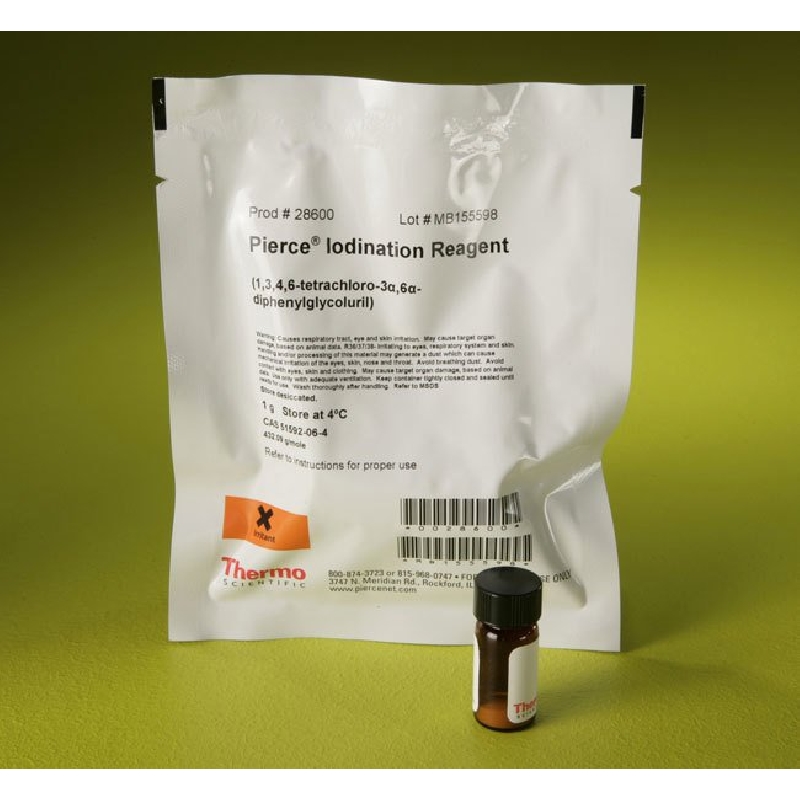 Thermo Scientific Pierce Iodination Reagent is 1,3,4,6-tetrachloro-3a,6a-diphenyl-glycoluril, an oxidizing agent that efficiently activates iodine for spontaneous incorporation into protein tyrosyl groups.
