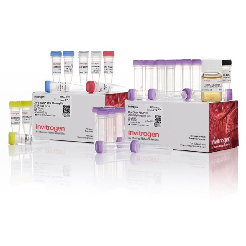 Zero Blunt® PCR cloning kits contain linearized pCR™-Blunt vector, ExpressLink™ T4 DNA ligase , 5X ExpressLink™ T4 DNA ligase buffer, control template, dNTPs, sterile water, and M13 forward and reverse primers. Competent cell kits contain One Shot® chemically competent E. coli, S.O.C. medium, and a supercoiled control plasmid.
