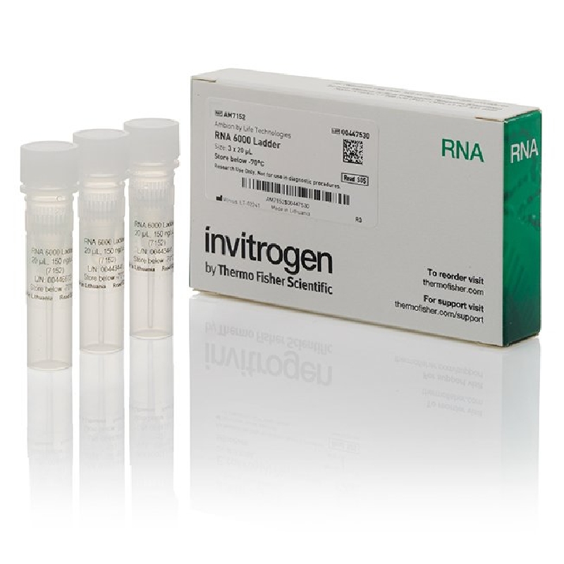 The Ambion® RNA 6000 Ladder is a set of six RNA transcripts with lengths of 0.2, 0.5, 1.0, 2.0, 4.0, and 6.0 kb. The 0.2 kb band is at a concentration of 20 ng/ µL (A260). The RNA 6000 Ladder is designed for use with Agilent's lab-on-a-chip. Three tubes containing 20 µL each are provided. 150 ng (1 µL) will generate 6 distinct bands when run on a RNA Labchip™ using the Total RNA or mRNA assay.