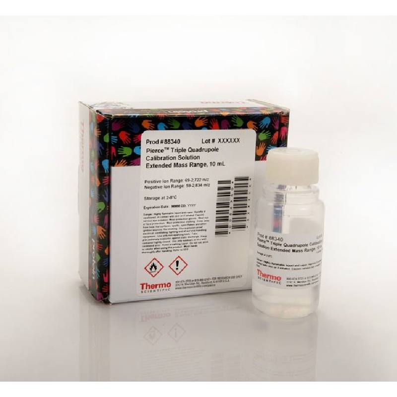 The Pierce Triple Quadrupole Calibration Solution is a ready-to-use formulation that has been optimized for both positive and negative ionization calibration of instruments. The extended range masses (69 m/z to 2800m/z) improve performance of the Thermo Scientific Quantiva™ and Endura™ Triple Quadrupole mass spectrometers. Additionally, the Triple Quadrupole Calibration Solution, Extended Mass Range, is manufactured at an ISO 9001 facility and each lot is quality controlled with strict specifications. The stable solution is provided in a leak-proof, high-purity PTFE bottle.