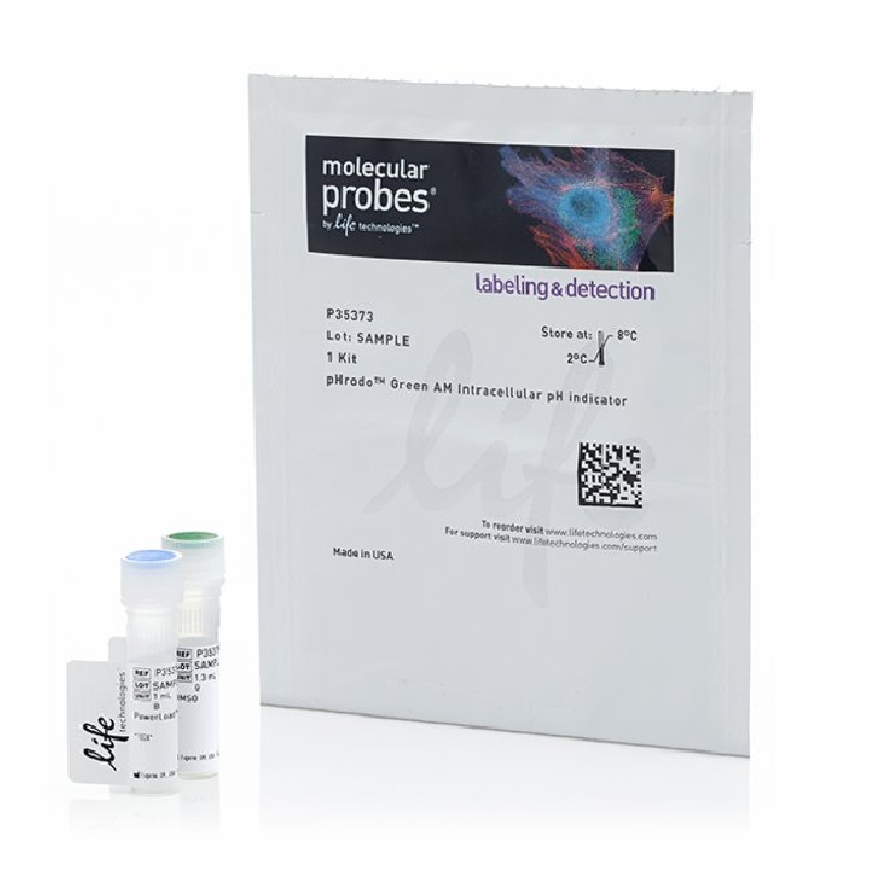 pHrodo Green AM Intracellular pH Indicator is a novel fluorogenic probe used to measure intracellular pH in live cells. pHrodo Green is weakly fluorescent at neutral pH but increasingly fluorescent as the pH drops. This reagent can quantify cellular cytosolic pH in the range of 9-4 with a pKa of ~6.5 with excitation/emission of 509/533 nm. pHrodo Green is photostable and appropriate for use in multiplexing experiments with red and deep red fluorophores such as RFP, Alexa Fluor 594, MitoTracker Red, and MitoTracker Deep Red.