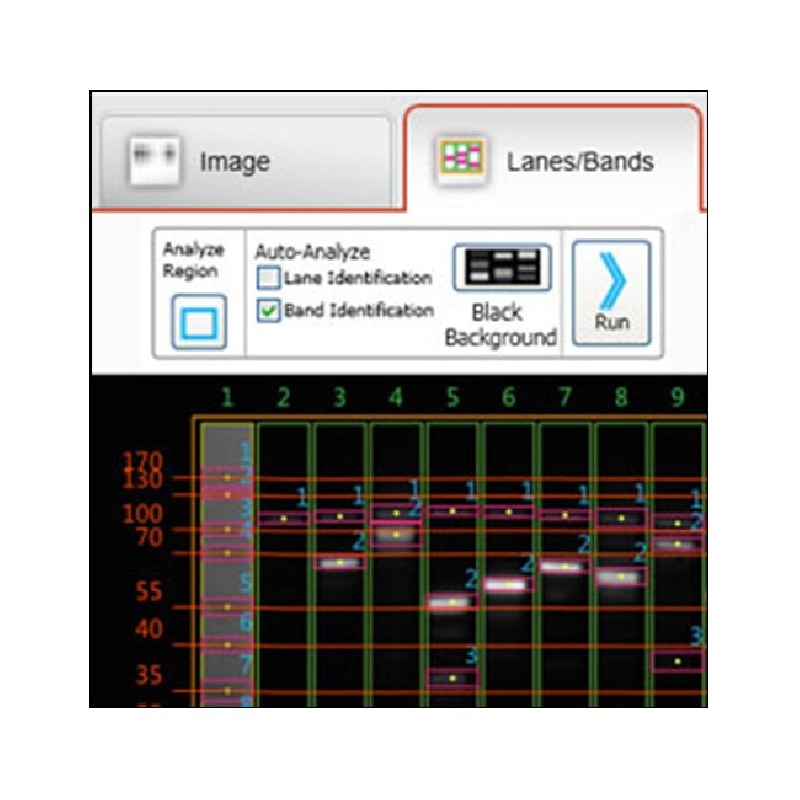 • Auto-identification—accurate, customizable, automatic lane and band identification creates numbered, selectable objects for lane profile densitometry and analysis