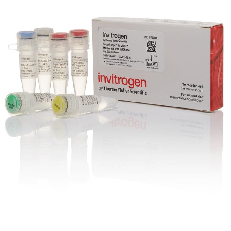 • SuperScript IV VILO Master Mix, 2 x 1 mL • SuperScript IV VILO Master Mix 'No RT' Control, 1 mL • ezDNase Enzyme, 500 µL • ezDNase Buffer (10X), 1 mL • Nuclease-free water, 1.25 mL Store at -5 to -30°C. |