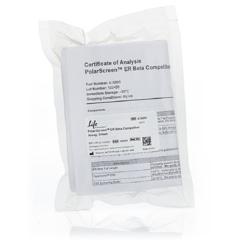 The PolarScreen™ ER Beta Competitor Assay Kit provides a sensitive and efficient method for high-throughput, fluorescence polarization-based screening of potential estrogen receptor (ER) beta ligands. The kit uses insect cell-expressed, full-length, native (untagged) human ER beta (A15664) and a novel, high-affinity, fluorescent estrogen ligand (Fluormone™ ES2) in a homogenous, mix-and-read assay format.