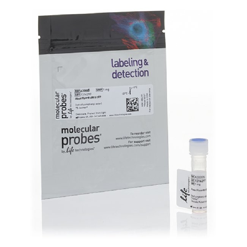 Tetrafluorophenyl (TFP) esters are an improvement over the succinimidyl ester (SE or NHS-ester) chemistry typically used to attach fluorophores or haptens to the primary amines of biomolecules. Both reactive chemistries produce the same strong amide bond between the dye or hapten and the compound of interest, but TFP esters are less susceptible to spontaneous hydrolysis during conjugation reactions. Alexa Fluor TFP esters are stable for several hours at the basic pH typically used for reactions – far outlasting succinimidyl esters.