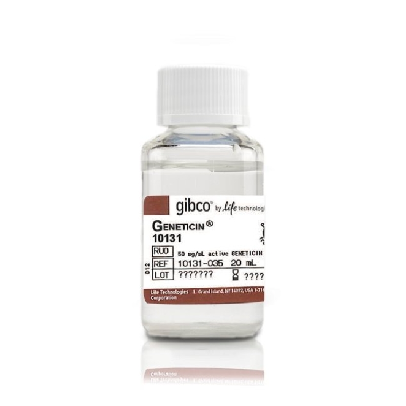 Geneticin® Selective Antibiotic (G418 Sulfate) is produced by the bacterium Micromonospora rhodorangea and acts by binding the ribosome, thus inhibiting protein synthesis in both prokaryotic and eukaryotic cells. Resistance to Geneticin® Selective Antibiotic (G418 Sulfate) is conferred by the E. coli APH (3’) – I and APH (3’) – II resistance genes. Gibco® Geneticin® Selective Antibiotic (G418 Sulfate) is used as a selective antibiotic in the concentration range of 100 - 200 µg/ml for bacteria, or 200 – 500 µg/ml for most mammalian cells. This product is supplied as a 50 mg/ml solution in water. We offer a variety of cell culture antibiotics for your convenience.