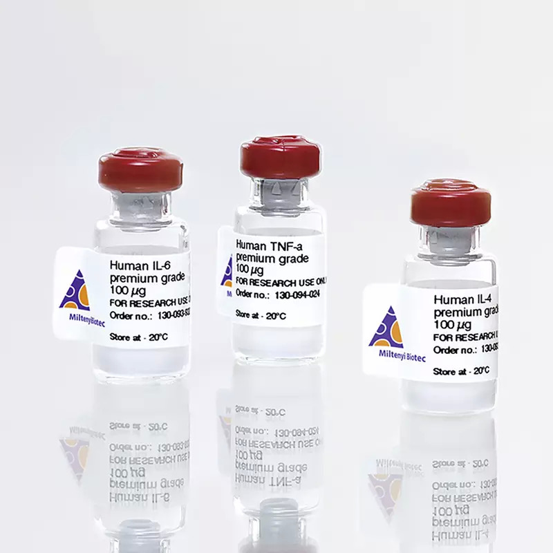 Premium-grade cytokines offer the convenience of high and well-defined biological activities and allow exact unit dosing for demanding applications. The biological activity is determined after lyophilization and reconstitution, and normalized to WHO/NIBSC standards whenever available. In general, endotoxin levels are <0.01 ng/μg (<0.1 EU/μg), and purities are >97%. Lot-specific activities are stated in the Certificate of Analysis (www. miltenyibiotec.com/certificates).