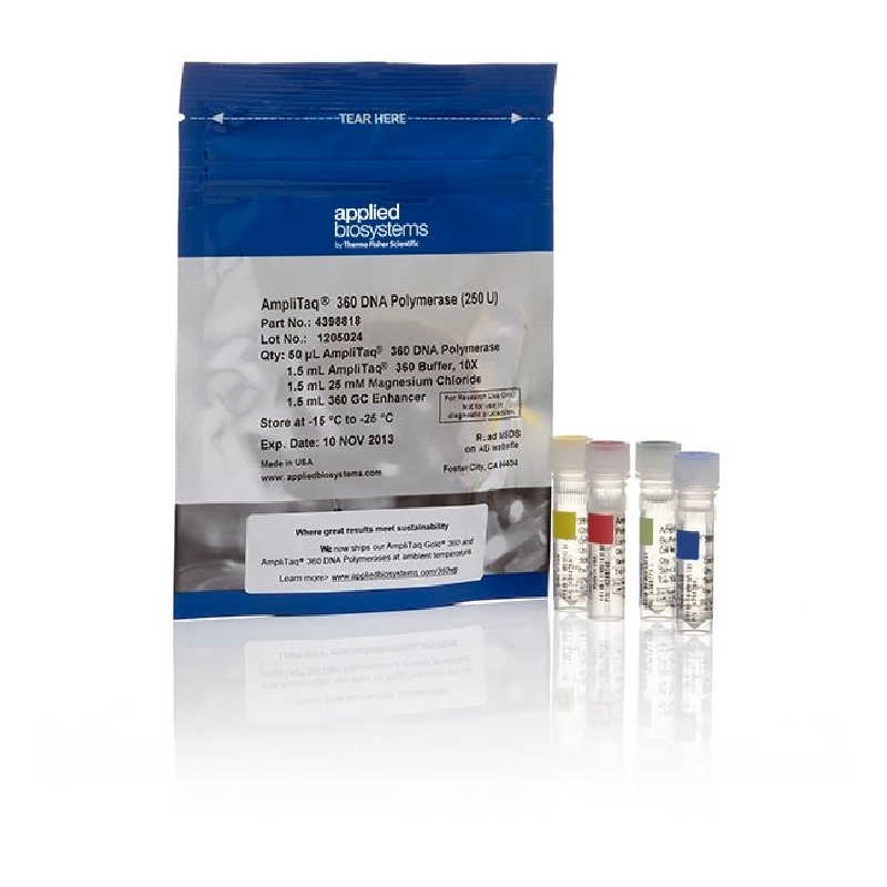 The Applied Biosystems AmpliTaq360 DNA Polymerase, when used with the new enhanced AmpliTaq 360 Buffer and the optional 360 GC Enhancer, amplifies a vast range of DNA sequence contexts. Compared to the original AmpliTaq DNA polymerase, AmpliTaq 360 polymerase is purified by an additional proprietary separation process which reduces contaminating bacterial DNA sequences from the enzyme preparation. This ultra-pure enzyme reduces false positive results, amplifies low-level target sequences, and when combined with the proprietary AmpliTaq 360 Buffer Kit, promotes the amplification of a variety of templates including those from bacterial and human genomes.