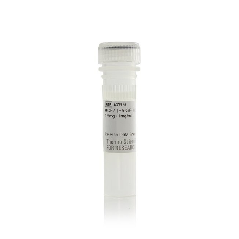The MCF-7 cell line is a human epithelial breast cancer cell line with estrogen, progesterone, and glucocorticoid receptor expression and is used as an in vitro model for breast cancer. The MCF7 (+hIGF-1) cell lysate is provided as frozen lysate at a standard concentration of 1 mg/mL (500 mg per vial). Lysates are prepared in non-denaturing buffer without loading dyes or dissociating agents (i.e., no 2-mercaptoethanol or dithiothreitol has been added). For western blot analysis, heat lysate to 95°C for 5 minutes. Add reducing agent before heating if desired. The recommended loading volume per lane is 10–20 μL (10–20 µg).