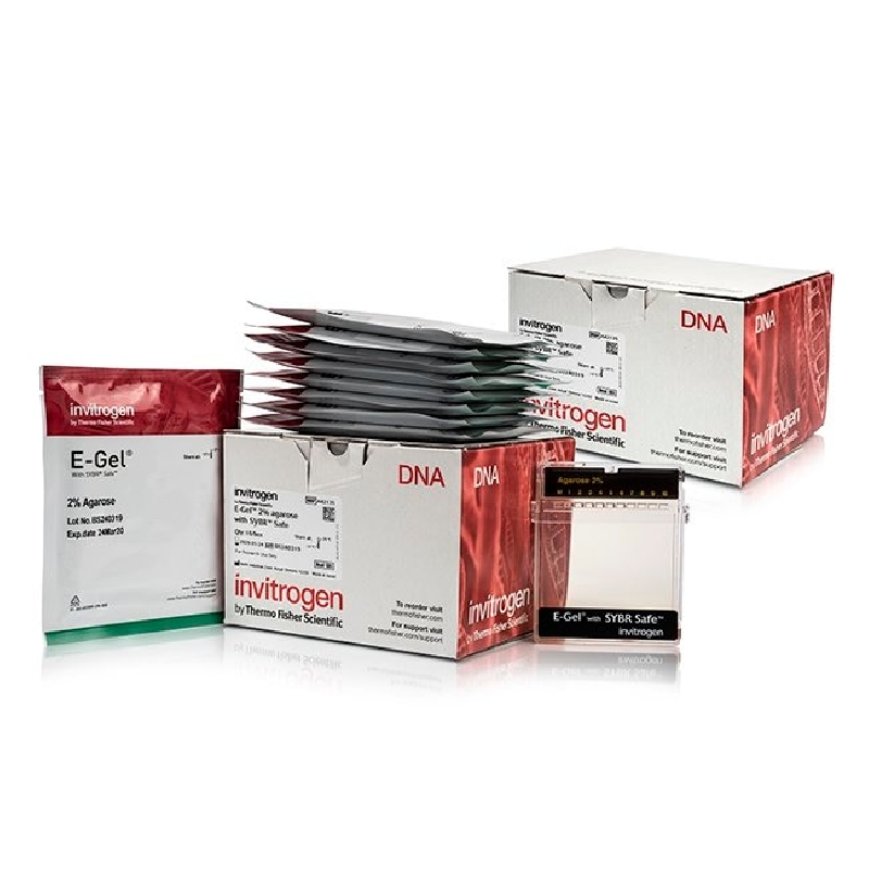 Invitrogen E-Gel precast agarose gels with SYBR Safe DNA gel stain are designed for fast, convenient, and safe DNA sample electrophoresis.Each E-Gel agarose gel cassette contains all components and stain required for efficient gel separation and analysis—just load your samples and run. E-Gel agarose gels are ideal for analyzing PCR products, restriction digests, plasmid preparations, or DNA fragment libraries.
