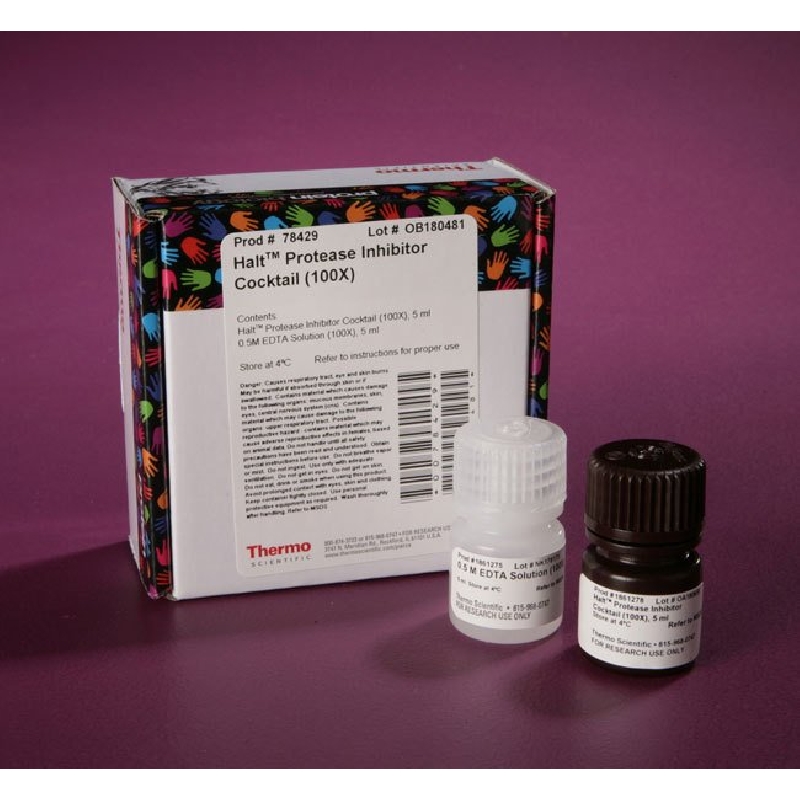 Thermo Scientific Halt Protease Inhibitor Cocktail (100X) are ready-to-use concentrated stock solutions of protease inhibitors for addition to samples to prevent proteolytic degradation during cell lysis and protein extraction.
