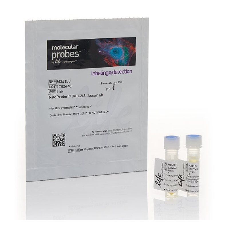 The MitoProbe™ DiOC2(3) Assay Kit provides solutions of the membrane-potential-sensitive cyanine dye DiOC2(3), and a mitochondrial membrane-potential disrupter, CCCP, for the study of mitochondrial membrane potential. DiOC2(3) penetrates the cytosol of eukaryotic cells and accumulates primarily in mitochondria with active membrane potentials, producing bright, red fluorescence. DiOC2(3) staining intensity decreases with decreased mitochondrial membrane potential, accompanied by a shift from red to green fluorescence.
