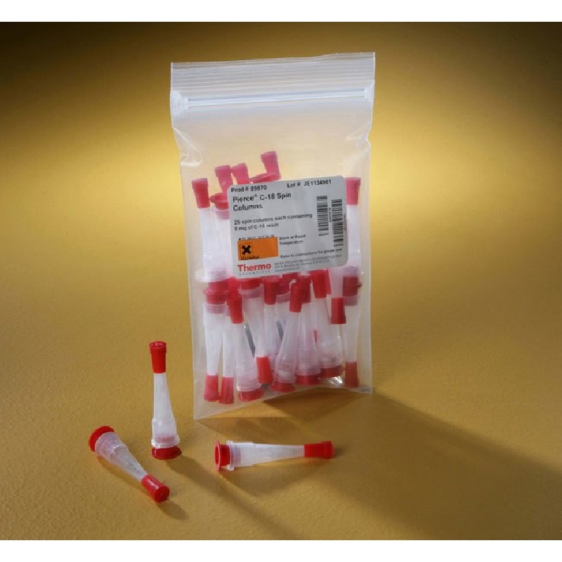 Peptide samples can be purified and concentrated for a variety of applications using Pierce C18 Spin Columns. Each spin column contains a porous C18 reversed-phase resin with excellent binding and recovery characteristics for a wide range of peptide concentrations. The spin column format allows simultaneous processing of multiple samples (10 to 150 µL each) in approximately 30 minutes without laborious repeat pipetting or specialized equipment. Pierce C18 Spin Columns can be used effectively for processing peptides derived from 10 ng to 30 µg of protein. Sensitivity and detection limits are dependent on the downstream application.