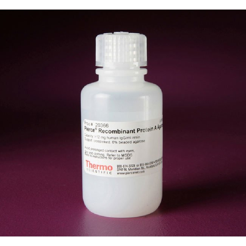 Thermo Scientific Pierce Recombinant Protein A Agarose is a beaded agarose resin to which a genetically engineered form of Protein A has been immobilized for use in IgG purification applications where the native ligand has undesirable effects.