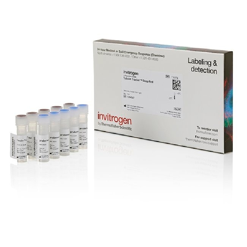 Contains sufficient material for at least 300 slides at 1 mL per slide and 1X working concentration. • 5 vials Tubulin Tracker Deep Red • 5 x 77 mg Probenecid Store at ≤–20°C after recieving. Desiccate and protect from light. When stored as directed, product is stable for at least 6 months. |