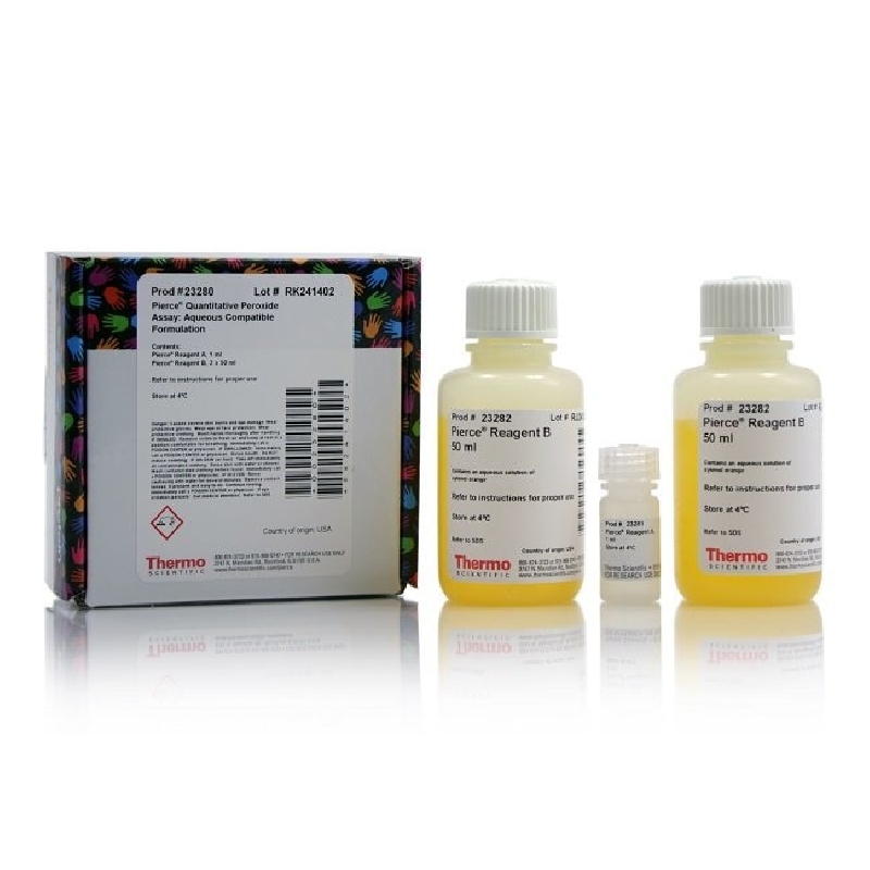 The Thermo Scientific Pierce Quantitative Peroxide Assay Kit (aqueous-compatible formulation) detects and measures hydrogen peroxide levels in biological samples using an iron and xylenol orange (XO) reagent.